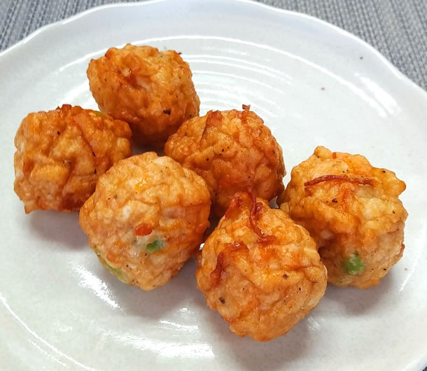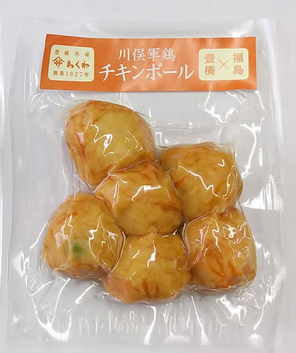 例2)福島県の地鶏「川俣軍鶏(かわまたしゃも)」に野菜や黒胡椒を加えて揚げた「川俣軍鶏チキンボール」